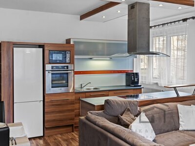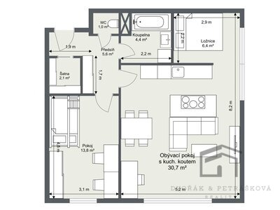 i ložnice (6,4 m2). Obývací pokoj (30,7 m2)včetně kuchyňského koutu se